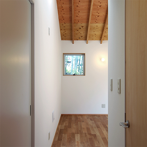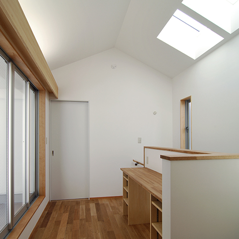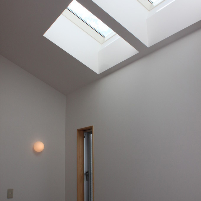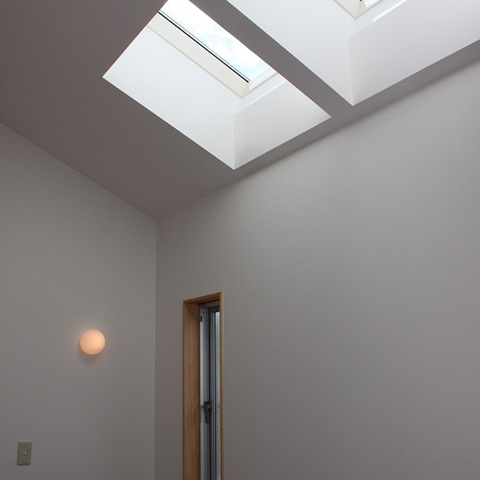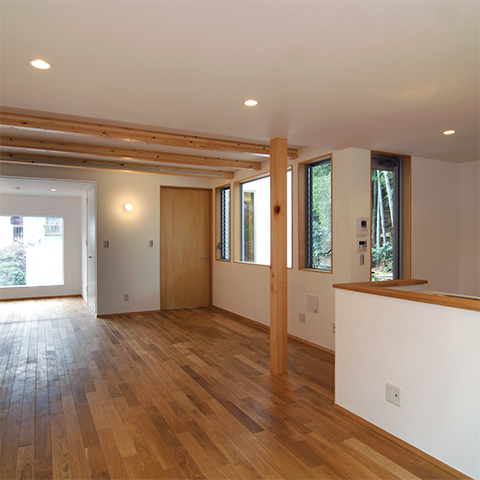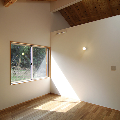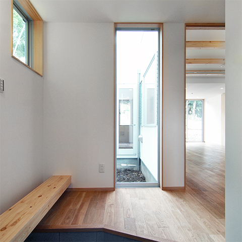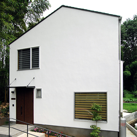 多摩丘陵を望む里山の風情を残す地域に建つ夫婦二人の為の住まいです。クライアントのご要望である「明るい家」をテーマに敷地周辺の眺望を取り入れた暖かみのある住まいが求められました。小さいながらも中庭を設け間接的な明るさを取り入れるように「凹」型のプランを眺望を考慮しながら配置しました。この小さい中庭は四季の移ろいを感じることが出来、また敷地境界や周辺との関係性に適度な「間」が生まれ開放感と奥行きを与えてくれました。素材については無垢の木と漆喰仕上げにより明るく清潔感のある住まいとなりました。
