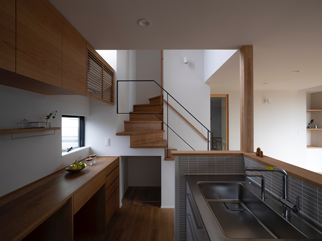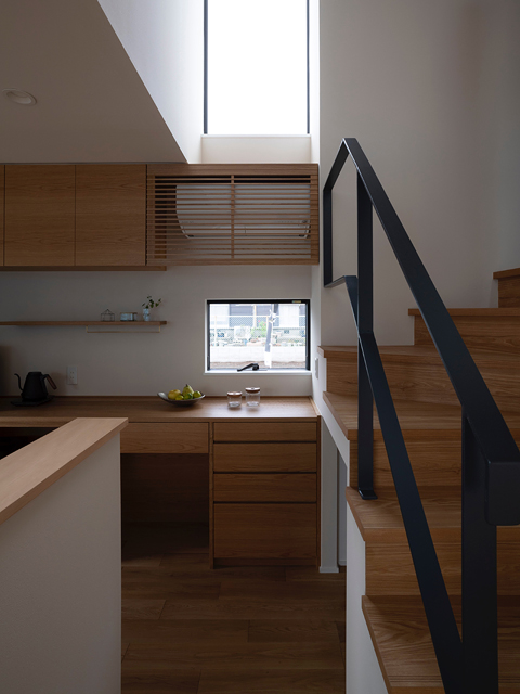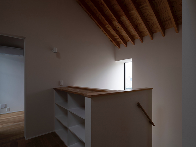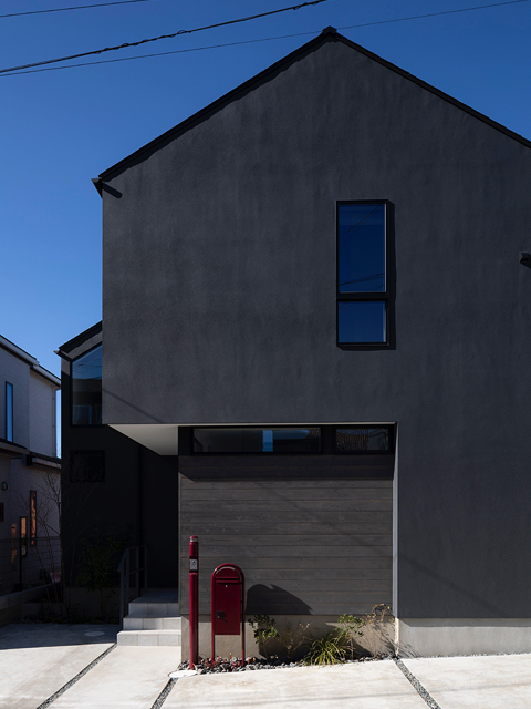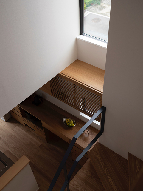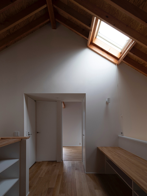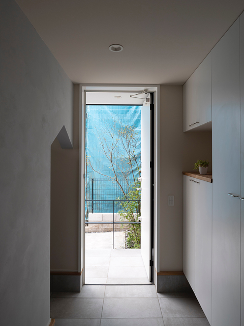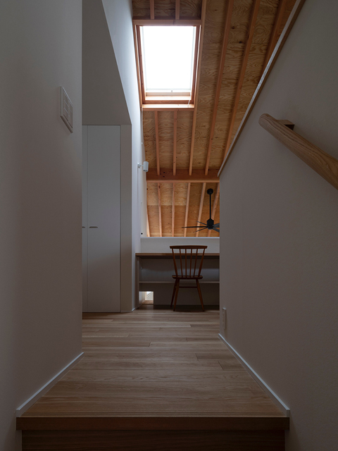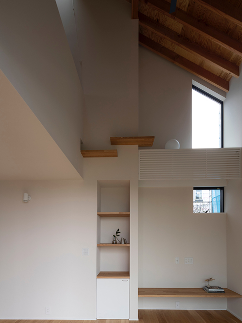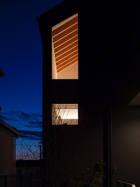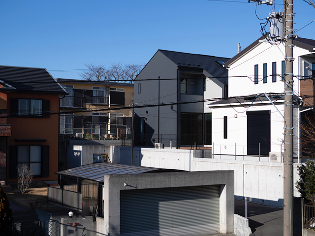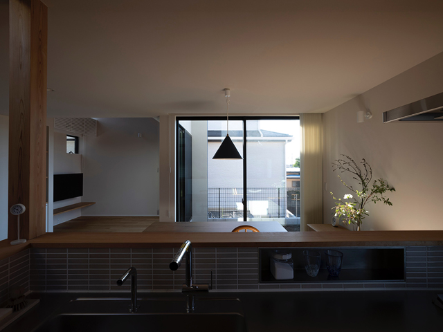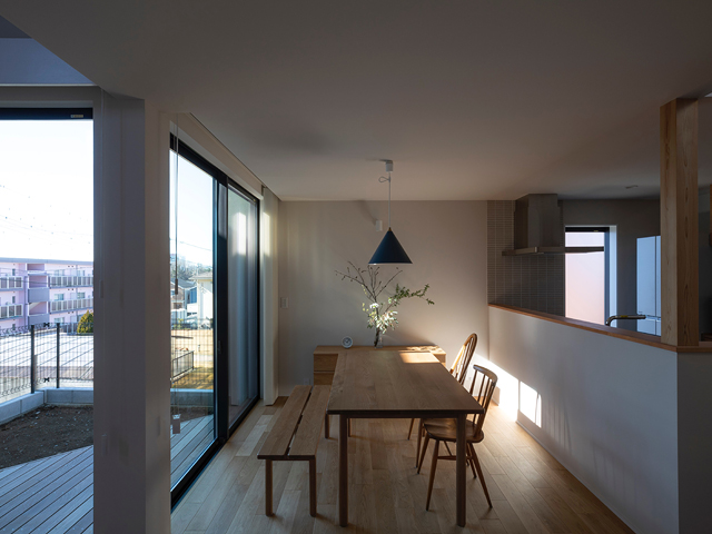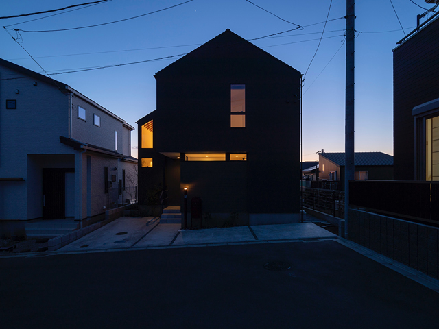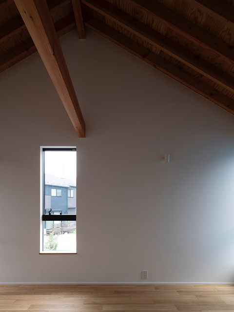 市街地に建つ4人家族の為の2階建の住宅です。 近い将来建て込んだ住宅地になる事が想定されるなか、遠くへと視線が抜ける庭を中心に据え、内と外が一体となる事で周囲の視線を気にする事なく開放感を感じられるプラン構成を考えました。そして開口部を絞り壁面に光の陰影をうつす事で、空間に奥行きを与えました。また勾配天井で包まれた空間が吹抜けで下階と一体になり、一つ屋根の下にいる感覚を呼び起こします。 藤沢の家は床面積だけでは測れない、光の移ろいや余白を感じる大らかな住まいとなりました。