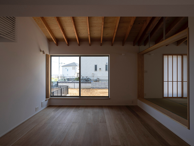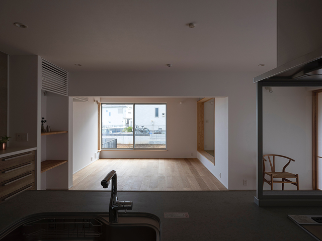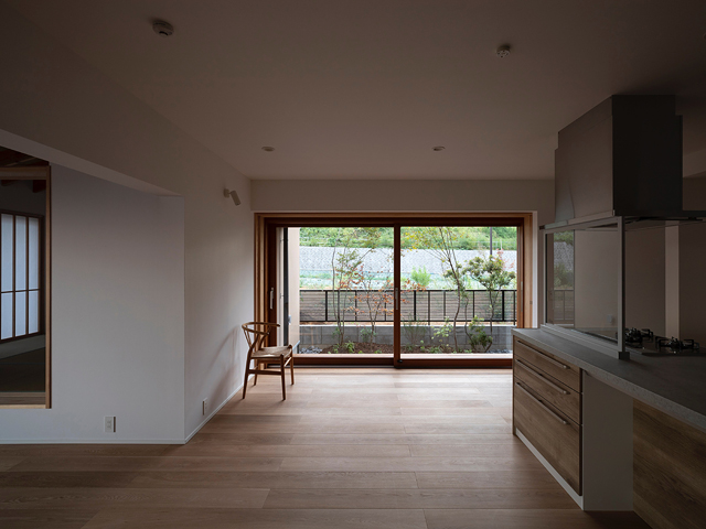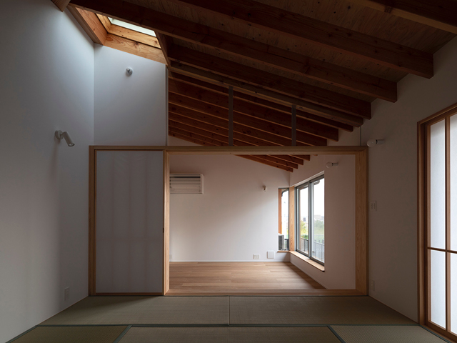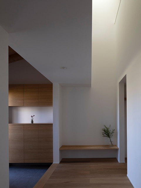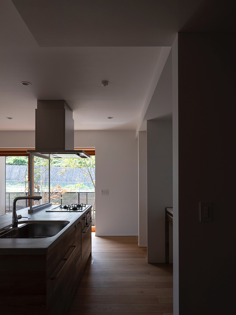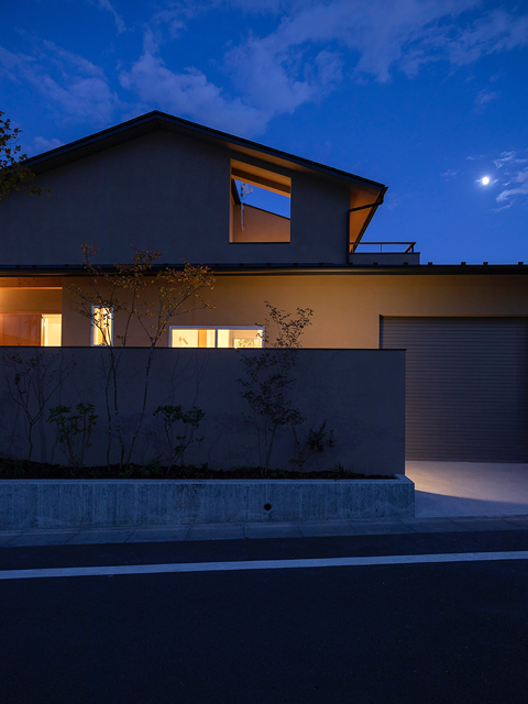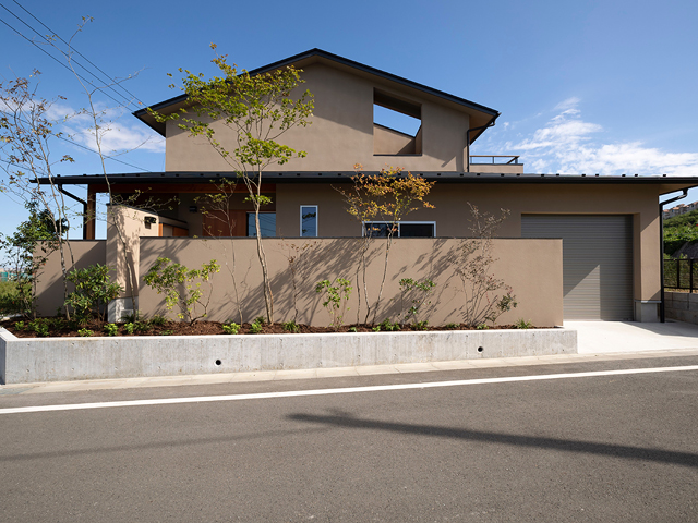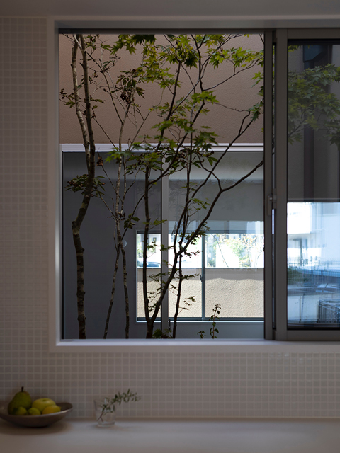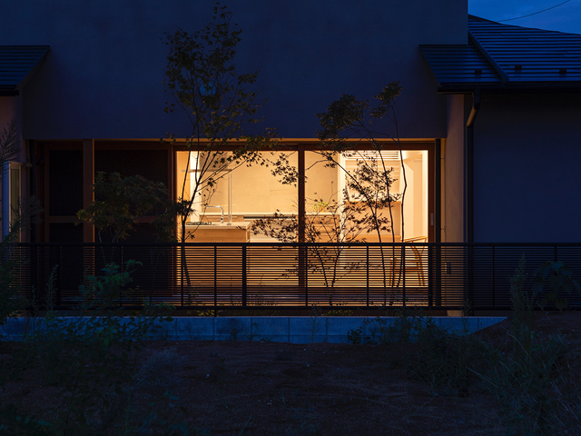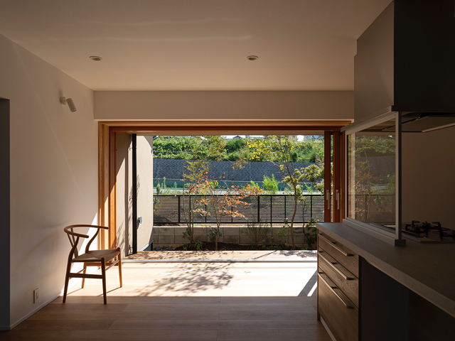 敷地は丘陵地を切り開いてつられた開発地にあります。 将来、周辺に家が立ち並んでも変わる事のない普遍的な美しさと、時間の変化を受け入れる和やかな住宅をイメージして設計を行いました。そして建物全体に風が流れ、光が行き届くように、中庭と吹抜けを効果的に取り入れました。またリビングの窓はフルオープンにすることで、内と外が一体となり家の中に居ながらにして豊かな樹々の中にいるような印象を生み出しました。 光や風、緑など自然と共にある暮らしに喜びを感じる住まいになって欲しいと思います。