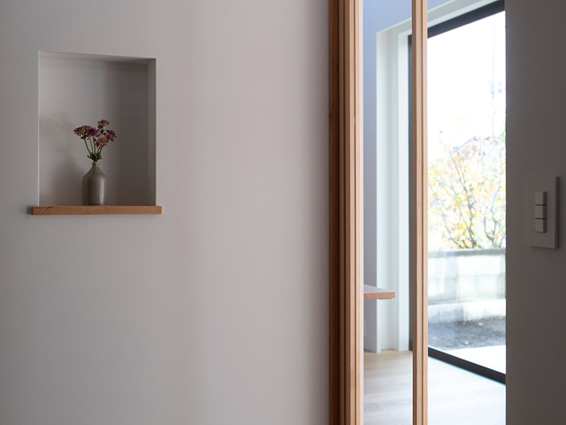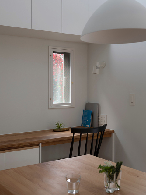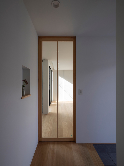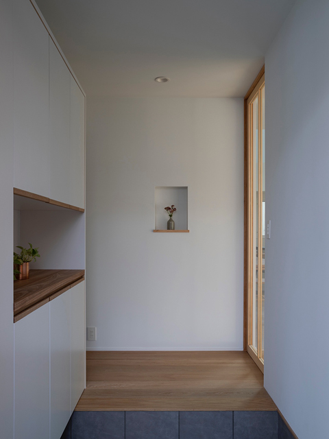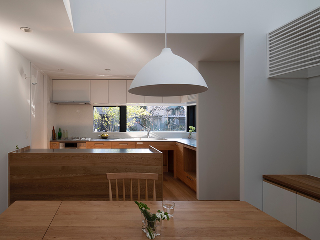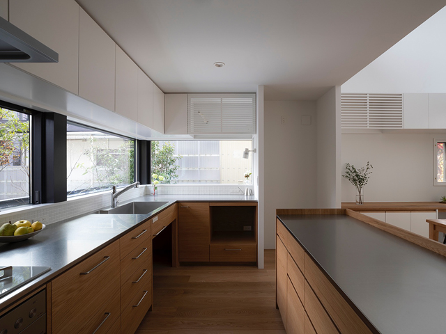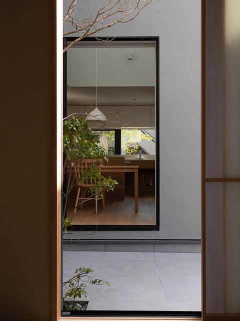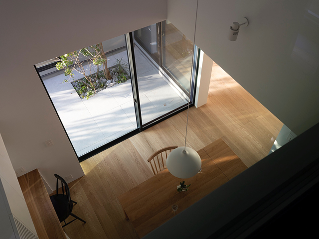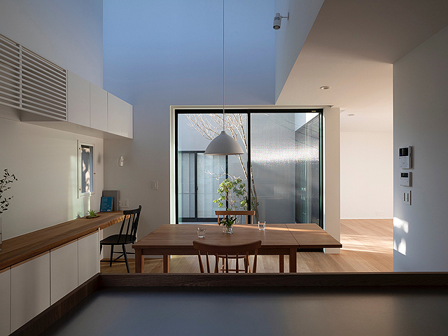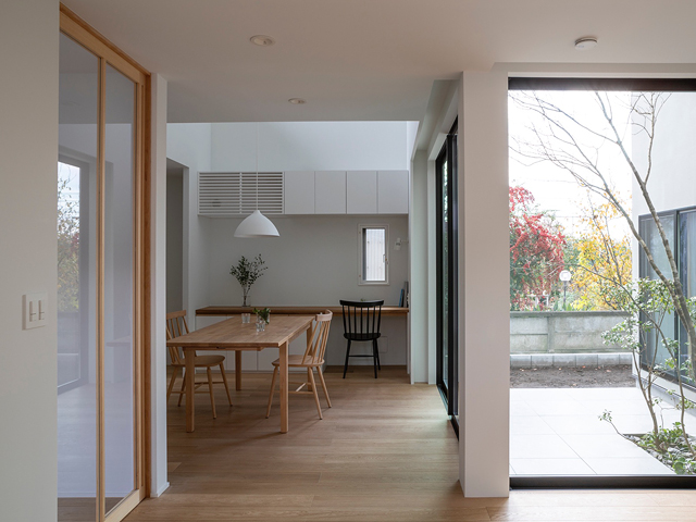 閑静な住宅地に建つ2世帯住宅の計画です。 建物の中心に中庭を設け、外部と内部が連続しながら展開していく空間が特徴的な住宅です。ダイニングキッチンとリビングは吹抜けや中庭と繋げる事で、それぞれの空間の距離感が程良く保たれるよう計画しました。 周囲からの視線を遮り安心感がありながらも開放感のある窓辺では、きっと穏やかな光の移ろいを感じることが出来るでしょう。 日々の暮らしの何気ない瞬間に、潤いを感じてもらえる事ができれば嬉しいです。