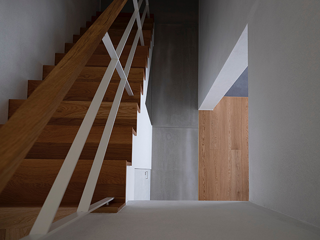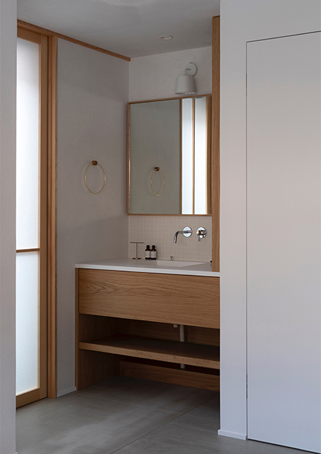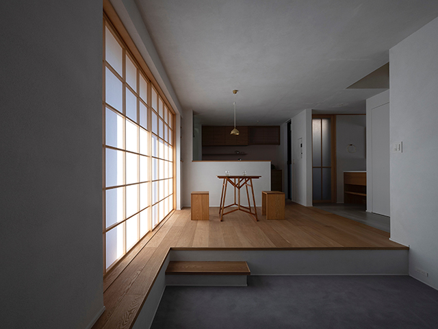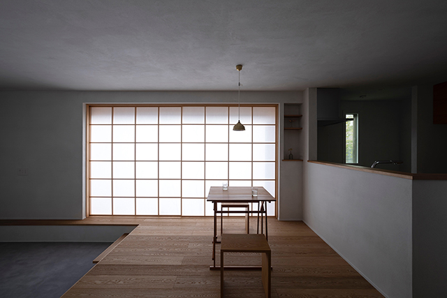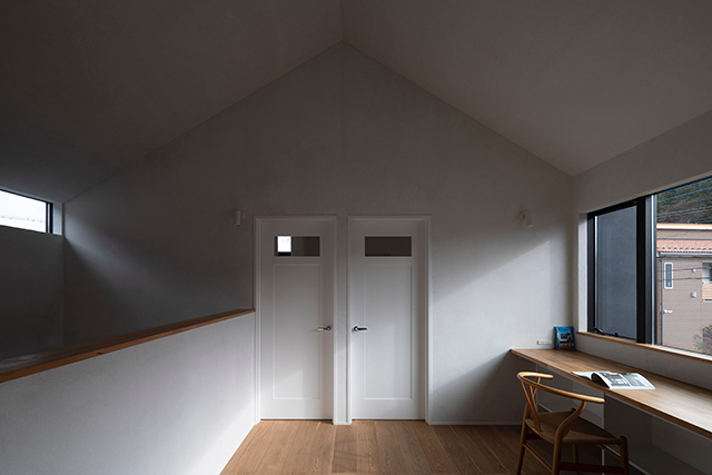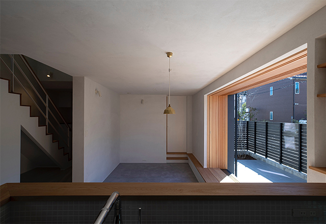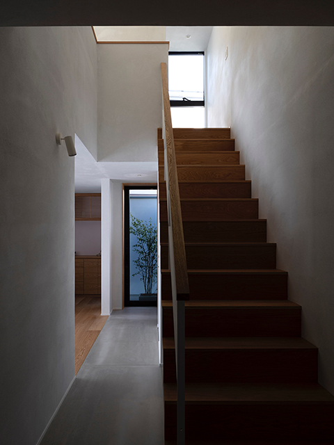 漆喰で仕上げた壁面が美しい光のグラデーションをつくり、吹抜で上下階が繋がる事で、包まれる安心感が生まれました。
