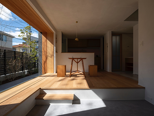 フルオープンする木製窓で内外が一体となり、リビングの窓辺は内とも外とも言えないような印象を作り出しています。