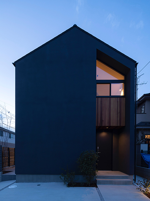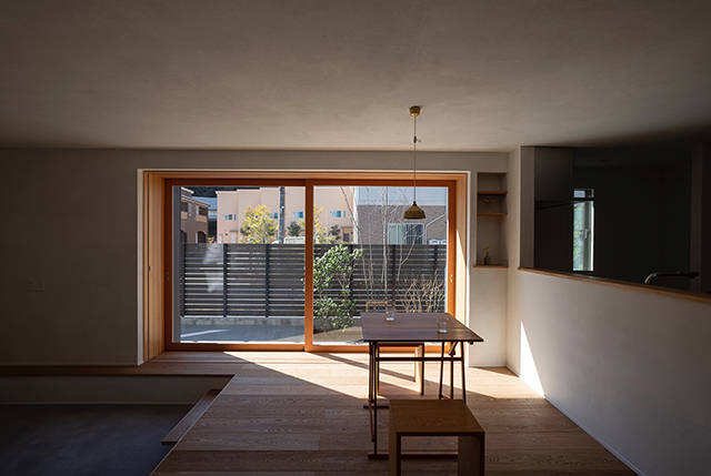 郊外の市街地に建つ、4人家族の為の住宅です。敷地周辺は隣家が迫る中、南側は公共水路に接するため、日照を十分に確保できる環境でした。そこで南側に小さなオープンスペースを設け雑木の樹々を植えました。そしてそのオープンスペースと内部が繋がるようなプラン構成としています。