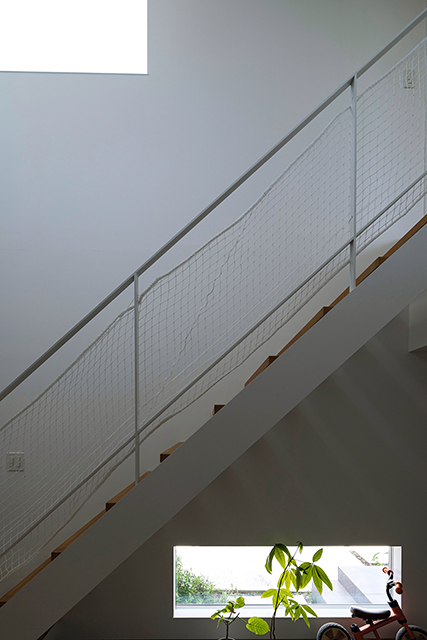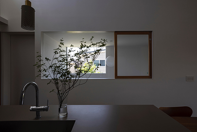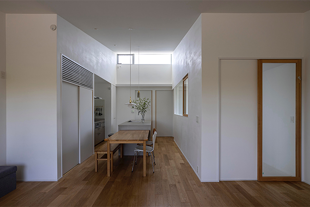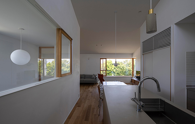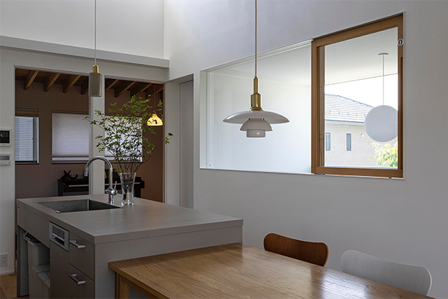 そこでキッチン、ダイニング、そしてリビングを連続させ、その先に広がる遠方の風景へ方向性を持たせるような空間構成としました。